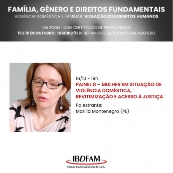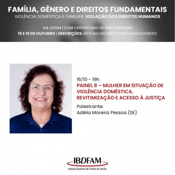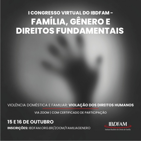 Nos dias 15 e 16 de outubro, será realizado o I Congresso Virtual do IBDFAM: Família, Gênero e Direitos Fundamentais. Com o tema “Violência doméstica e familiar: violação dos Direitos Humanos” e certificados de participação, o evento terá transmissão ao vivo por meio da plataforma Zoom. Inscreva-se.